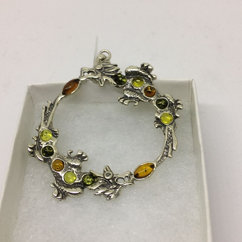 Duo Dragons set in silver with Multi- color Amber circle pendant. Approx. 1.5″x 1.5″