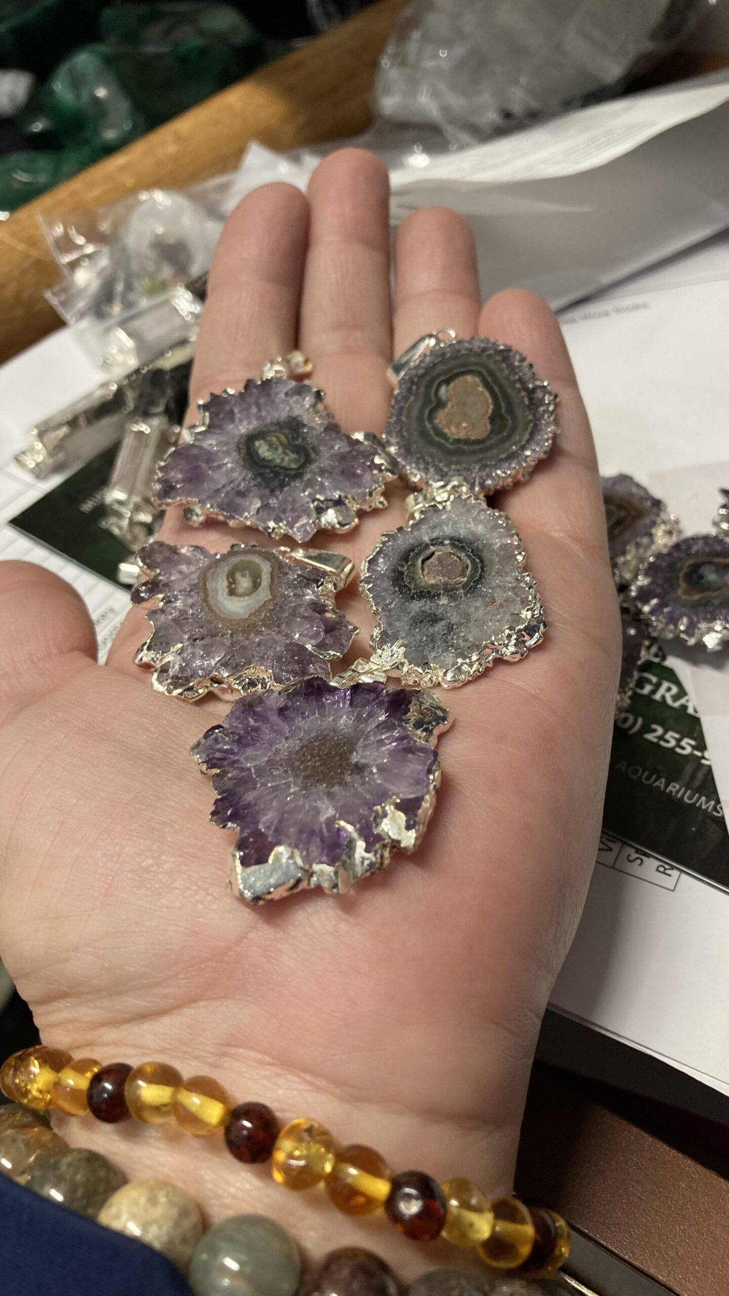 Beautiful cut amethyst pendants. Approximately 1.5 ” wide. Various designs.