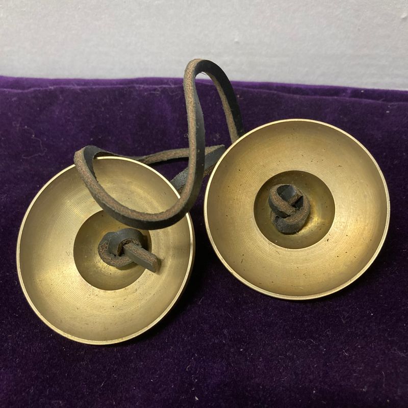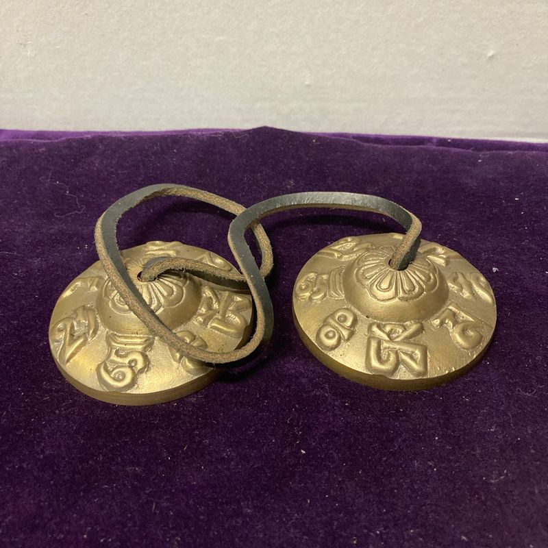 Tingshas  with auspicious symbols on leather cord used for meditation, cleansing negative energy and more….