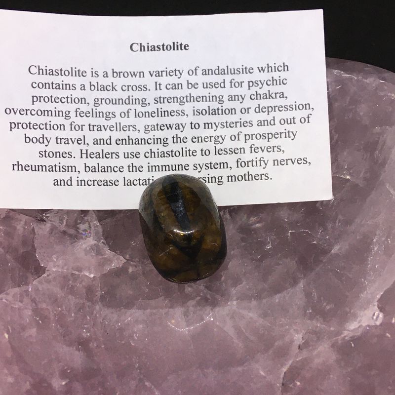 Chaistolite is a brown variety of andalusite which contains a black cross. Used for psychic protection, grounding and strengthening any chakra. Helps overcome feelings of loneliness, isolation or depression. Protects travellers. gateway to mysteries and out of body travel and more.