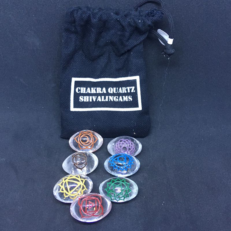 All Seven chakras engraved on crystals shaped like shiva linghams in a velvet pouch. Crystals are approx. .75″ x .50″