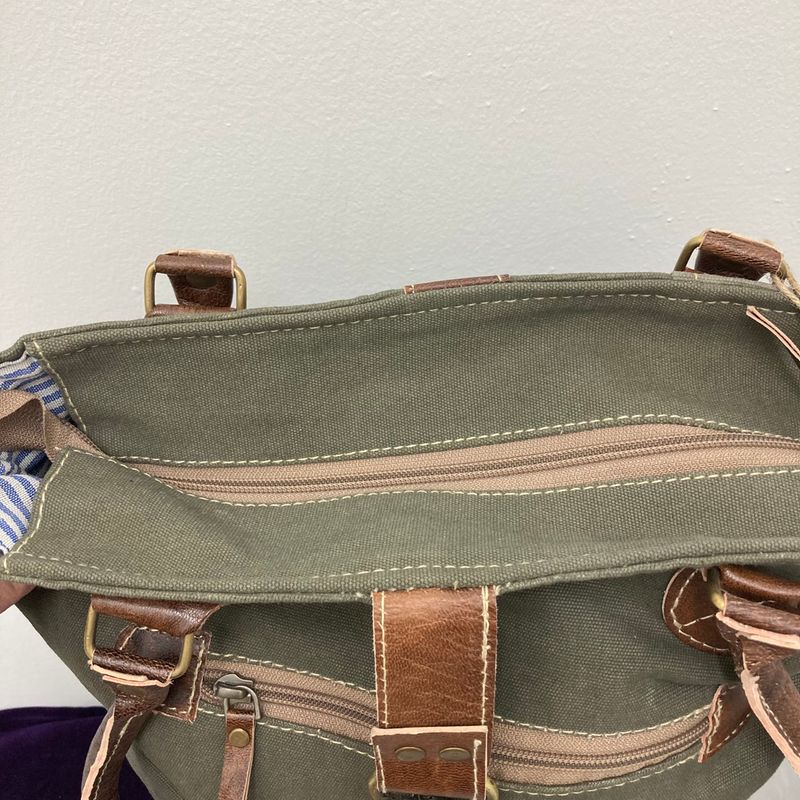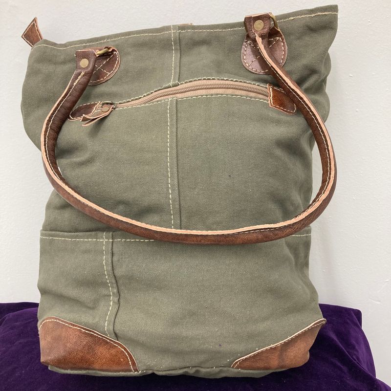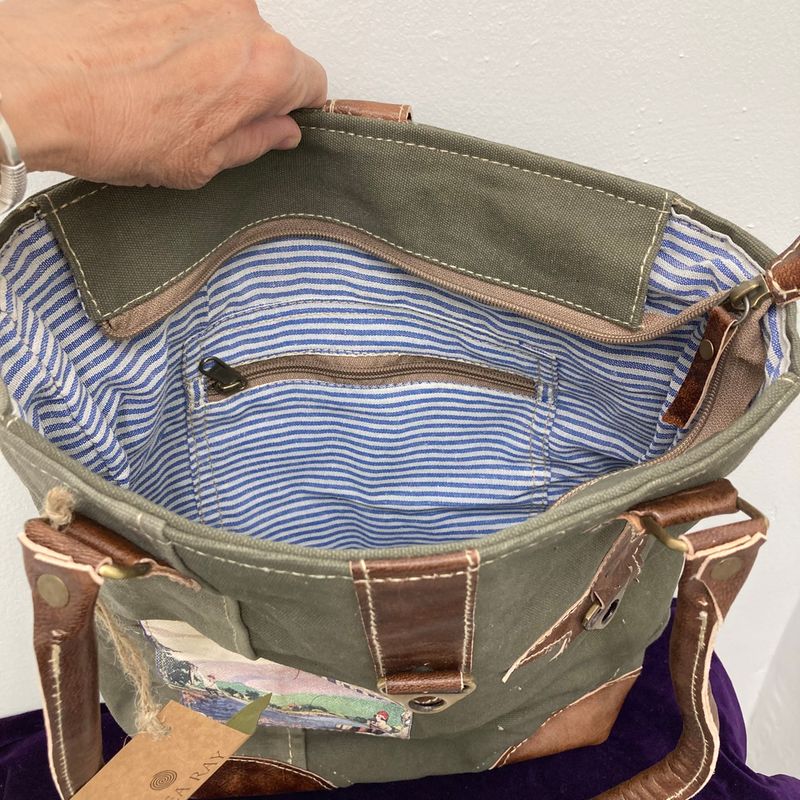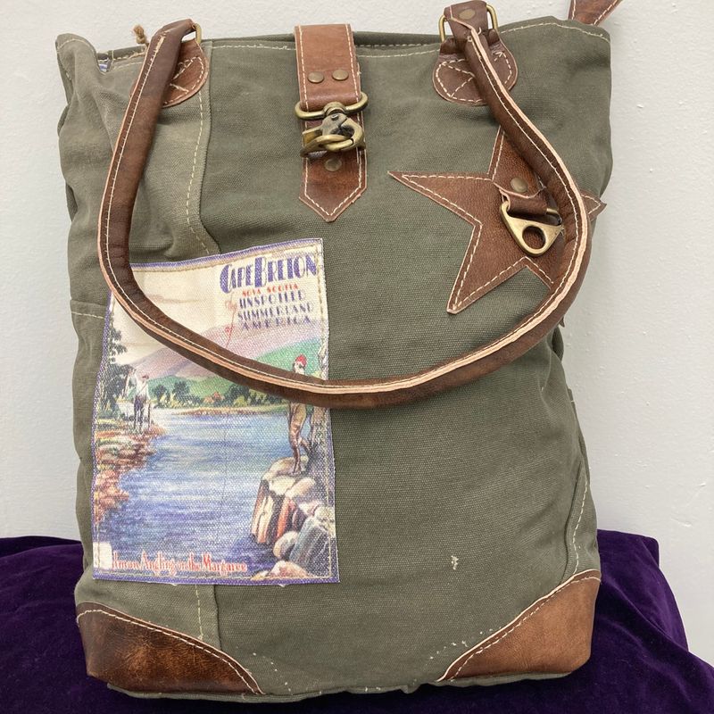 Made with recycled army canvas and leather these purses are very durable! This one has a vintage label copy of Cape Breton.  15″ tall x 13″ wide x 4″ deep  Made in India