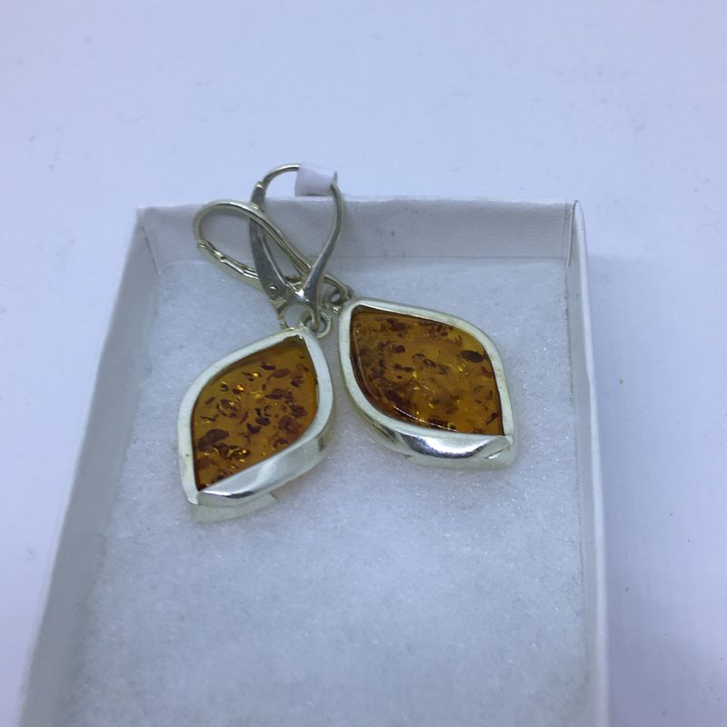 Unique shape, Honey amber in sterling earrings. approx. 1.75″ x .5″