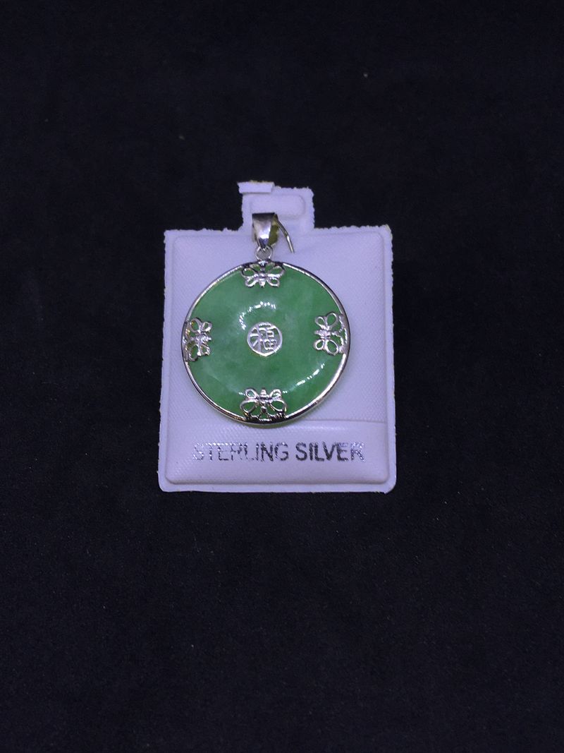 Jade set in sterling silver with designs approx. 1″ x 1″.