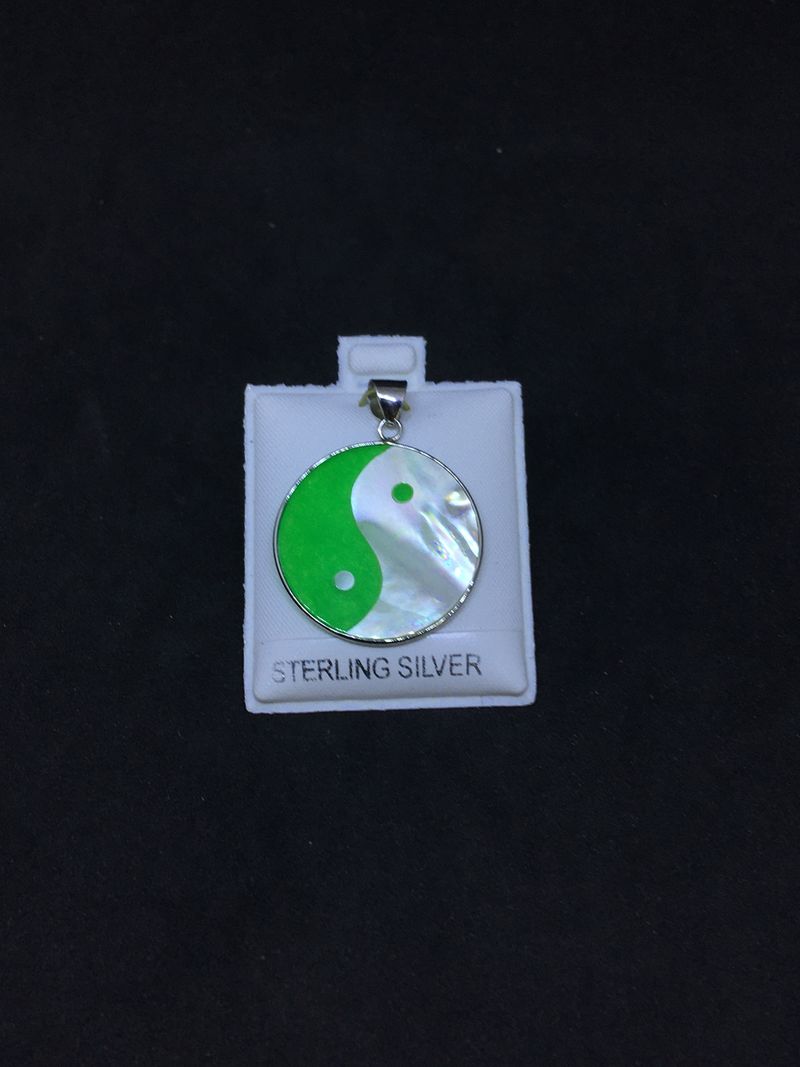 Set in sterling silver with a yin yang pattern this jade and mother of pearl pendant is approx. 1″ w.