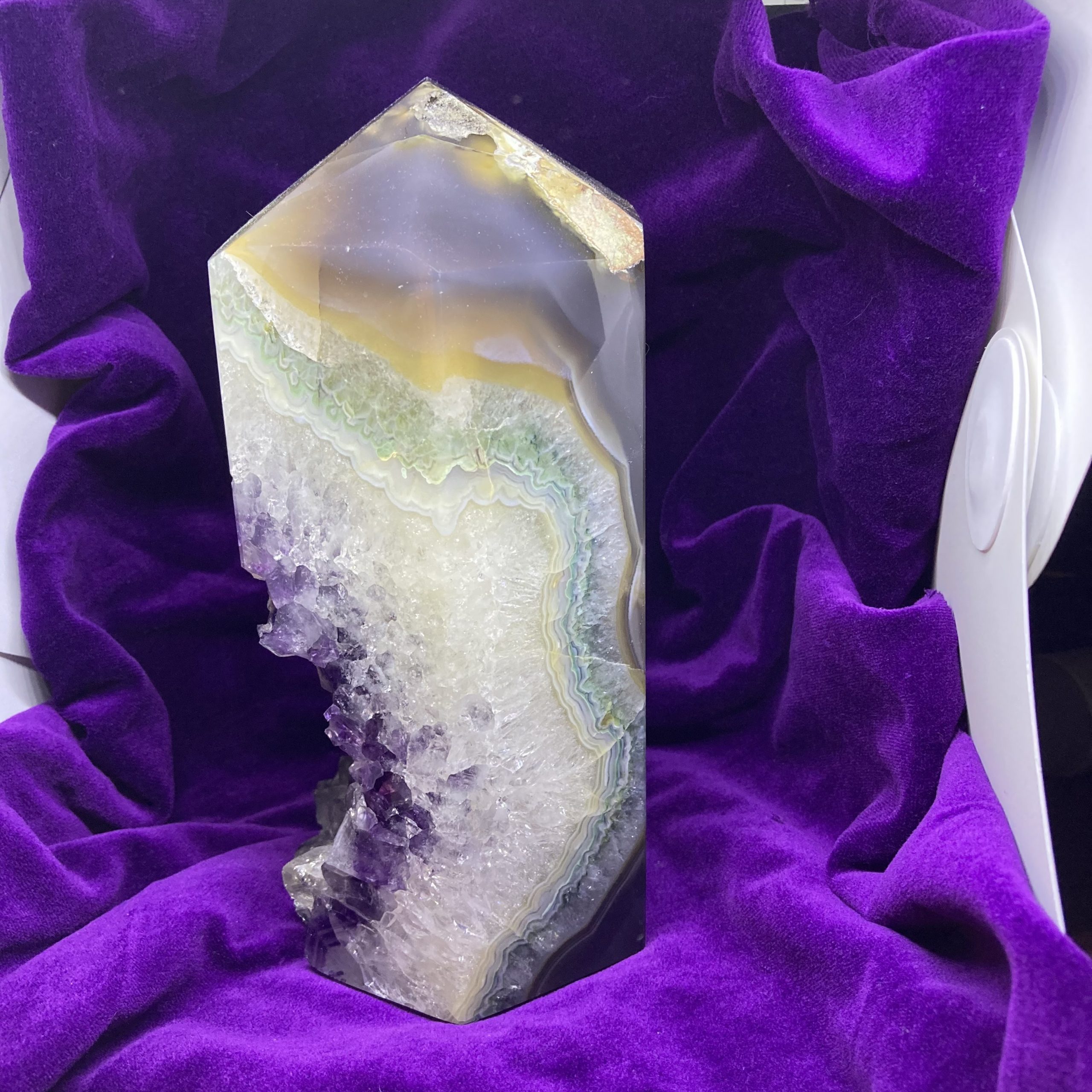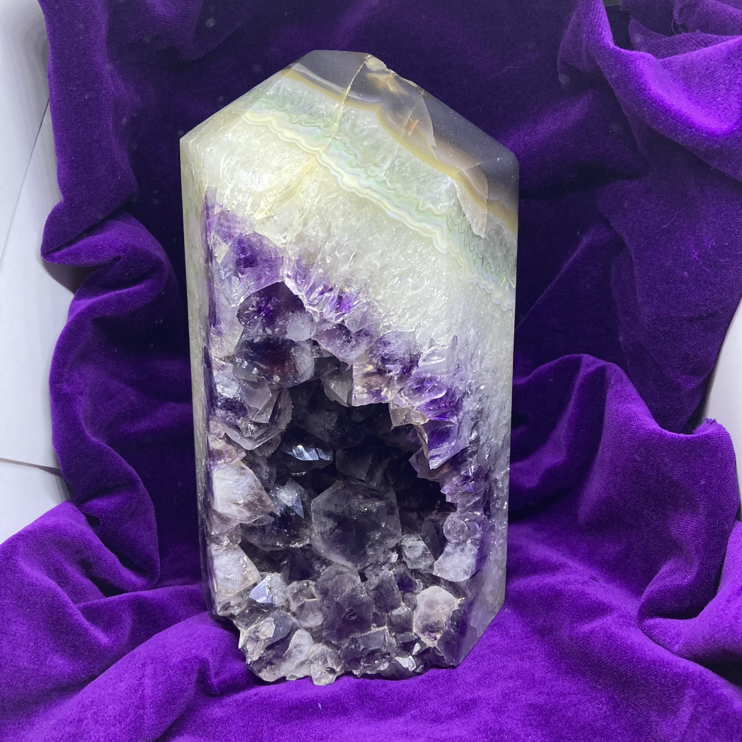 This is an amazing one-of-a-kind partly polished amethyst point measuring 8″ tall x 4″ x 4″. Weighs 3.13 kgs