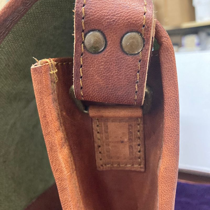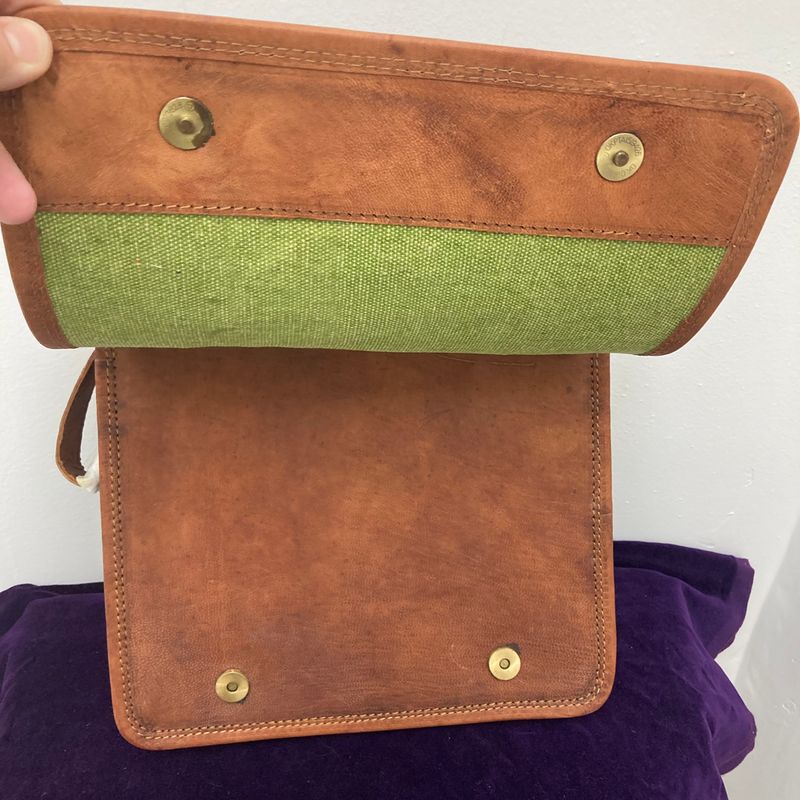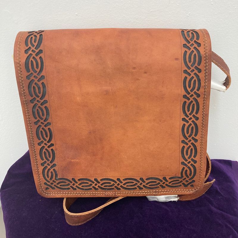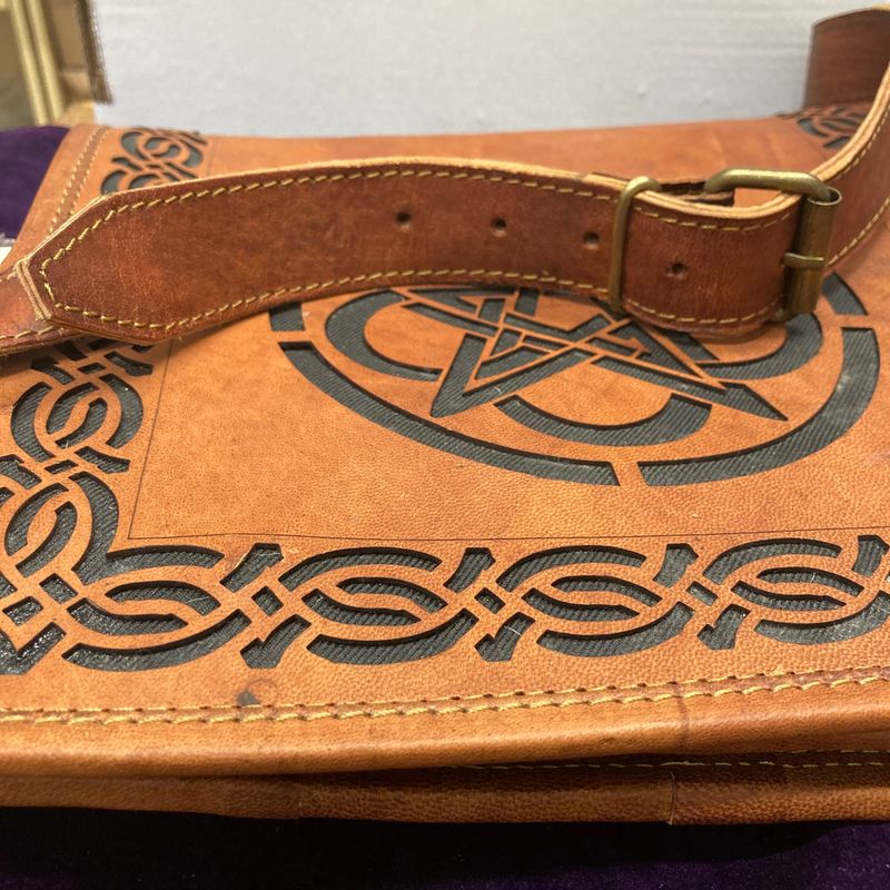 Heavy duty leather, very well made, feels like saddle leather with a laser cut pentagram design on front. Strap is 54″ long with buckle for adjusting length. Will also make an awesome bag for laptop or ipad. Purse is 11″ x 11″ x 3″ deep.
