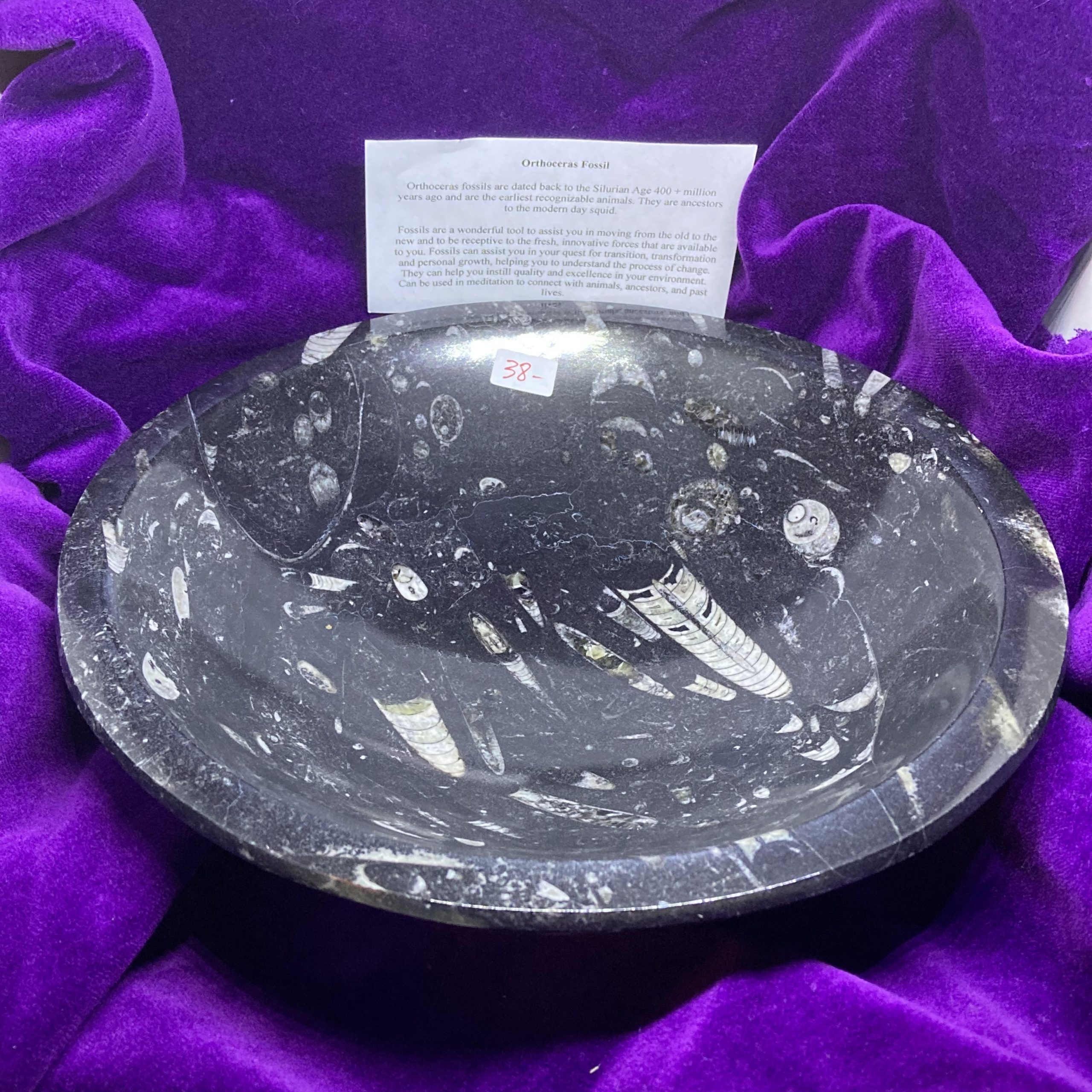 No two are alike in design but they are all beautiful! The bowls are approx. 8″ in diameter and 2″ deep. These fossils date back 400+ million years and are the ancestors of the modern day squid. They weigh approx. .8 KG