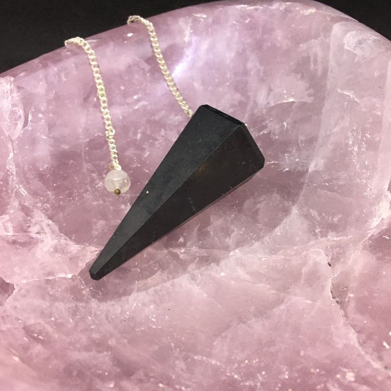 Shungite faceted pendulum on 6″ chain. Shungite boosts energy and immune system, protects from harmful EMF’s, detoxifies and purifies the body. Balances the mind and body.