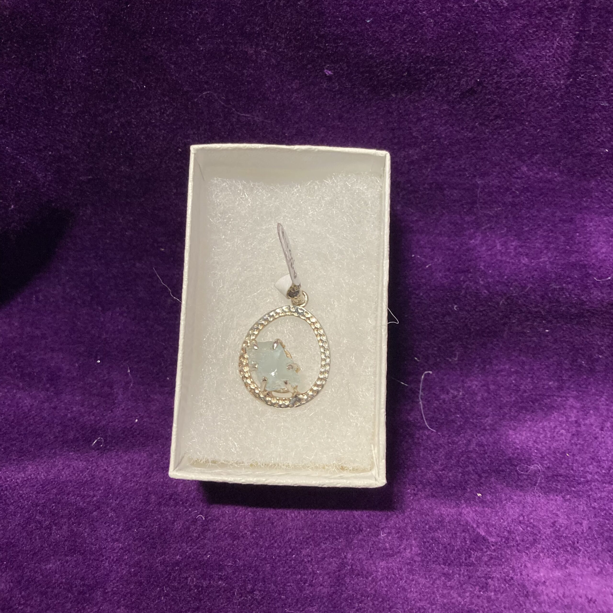 Natural aquamarine piece set in sterling silver pendant by Peterstone. Approx. 1.25″ long.