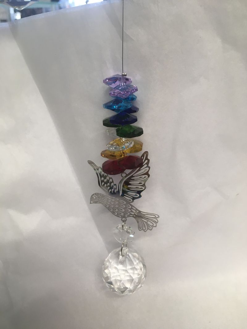 Bright, beautiful lead crystals with assorted themes. Average length 7″ to 9″ long. Colored glass beads to catch even the smallest light.