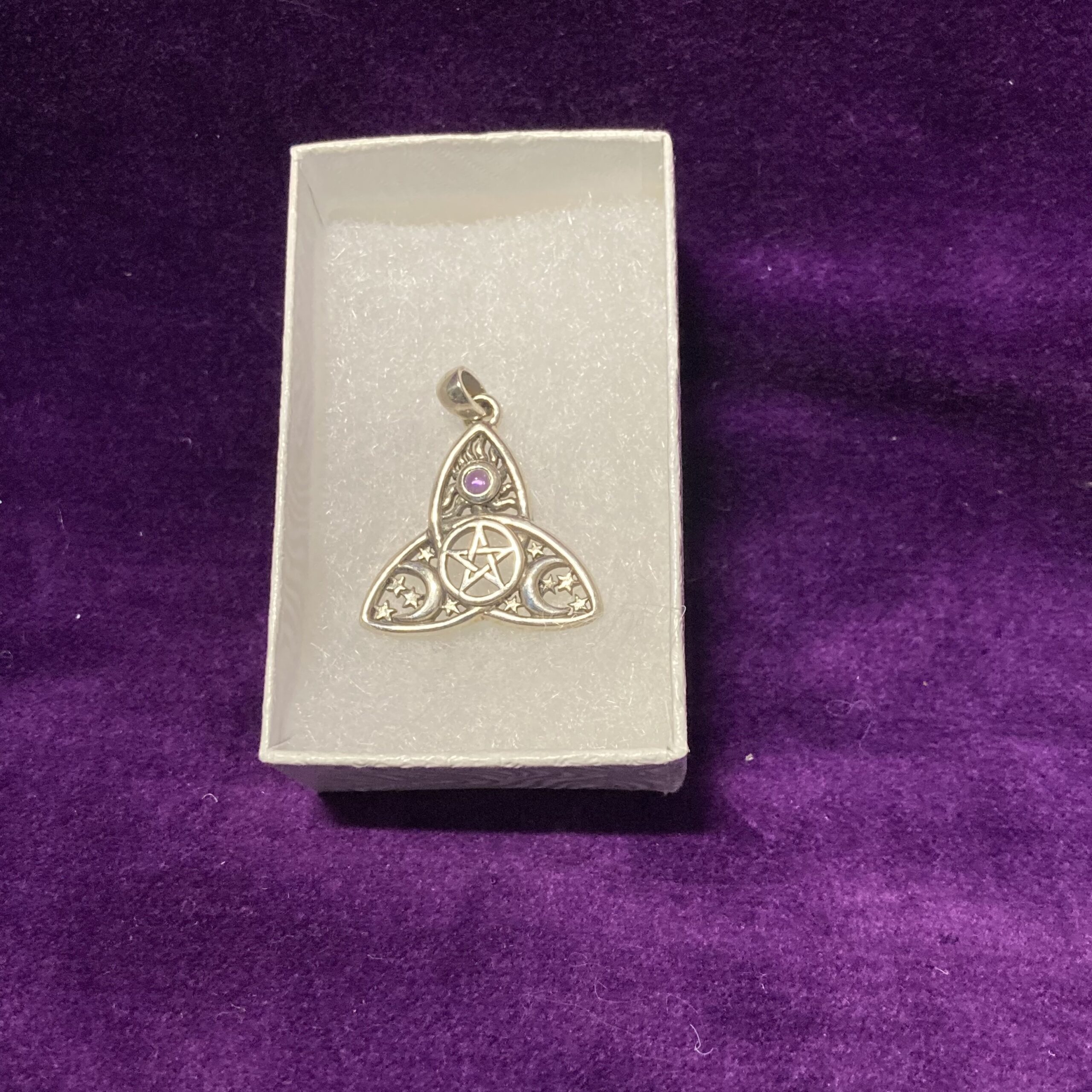 Sterling silver triquatra pendant with pentacle and amethyst gemstone by Peterstone. Approx. 1.25″ long.